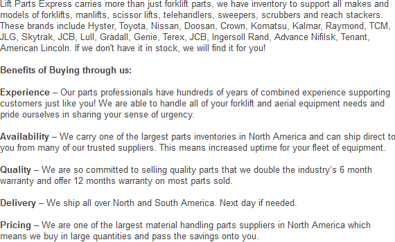 We provide you the best deals on all parts for your fleet of lift trucks. Call now to get a price quote on one of the parts or attachments we offer. We can be reached at: